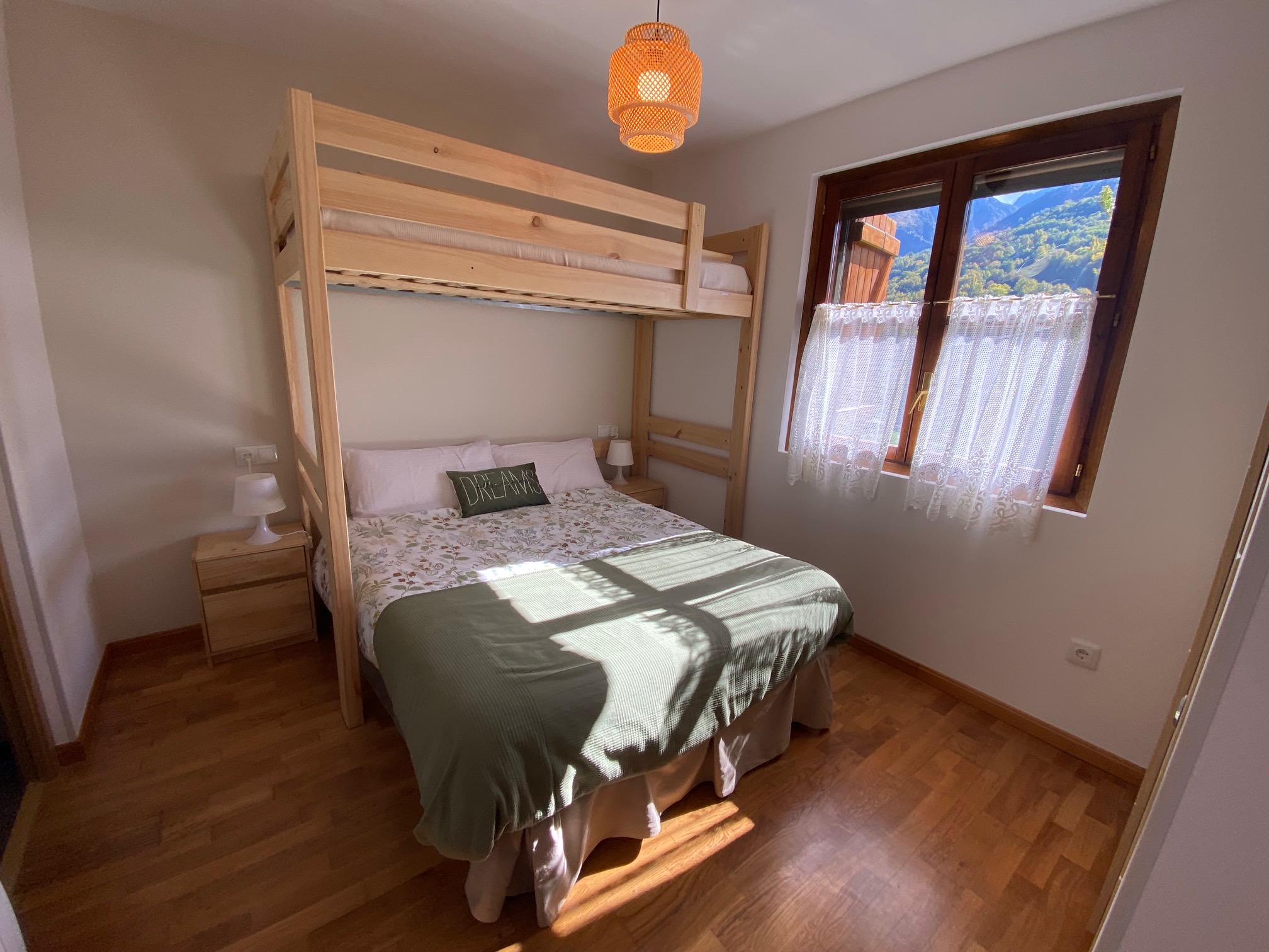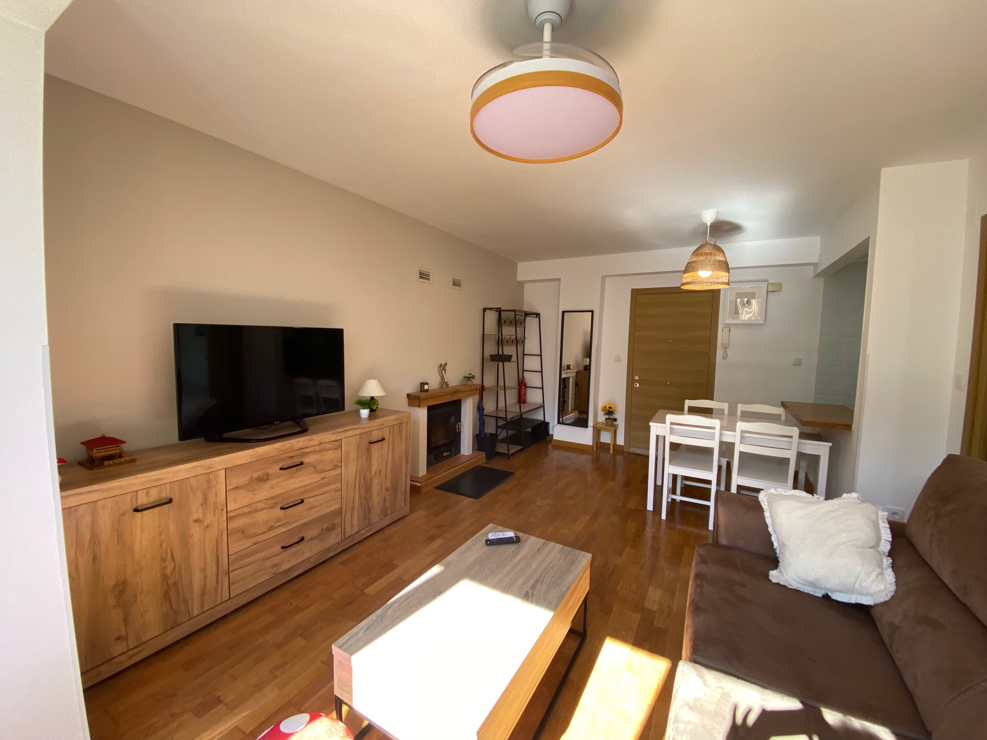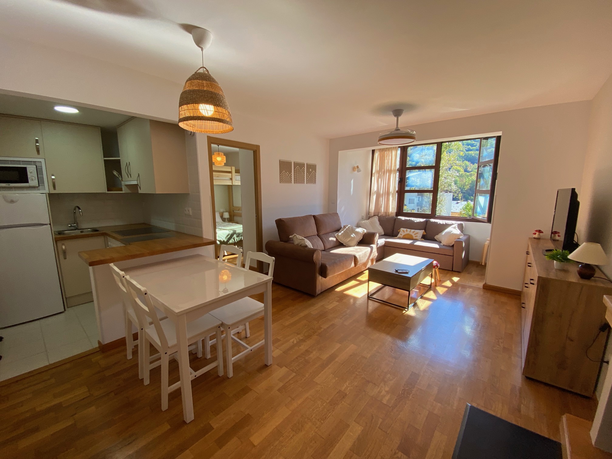 Apartamento de 1 dormitorio con cama de matrimonio. Tiene garaje y trastero amplio. Sofá-cama en el salón y accesorios para niños y bebés.
